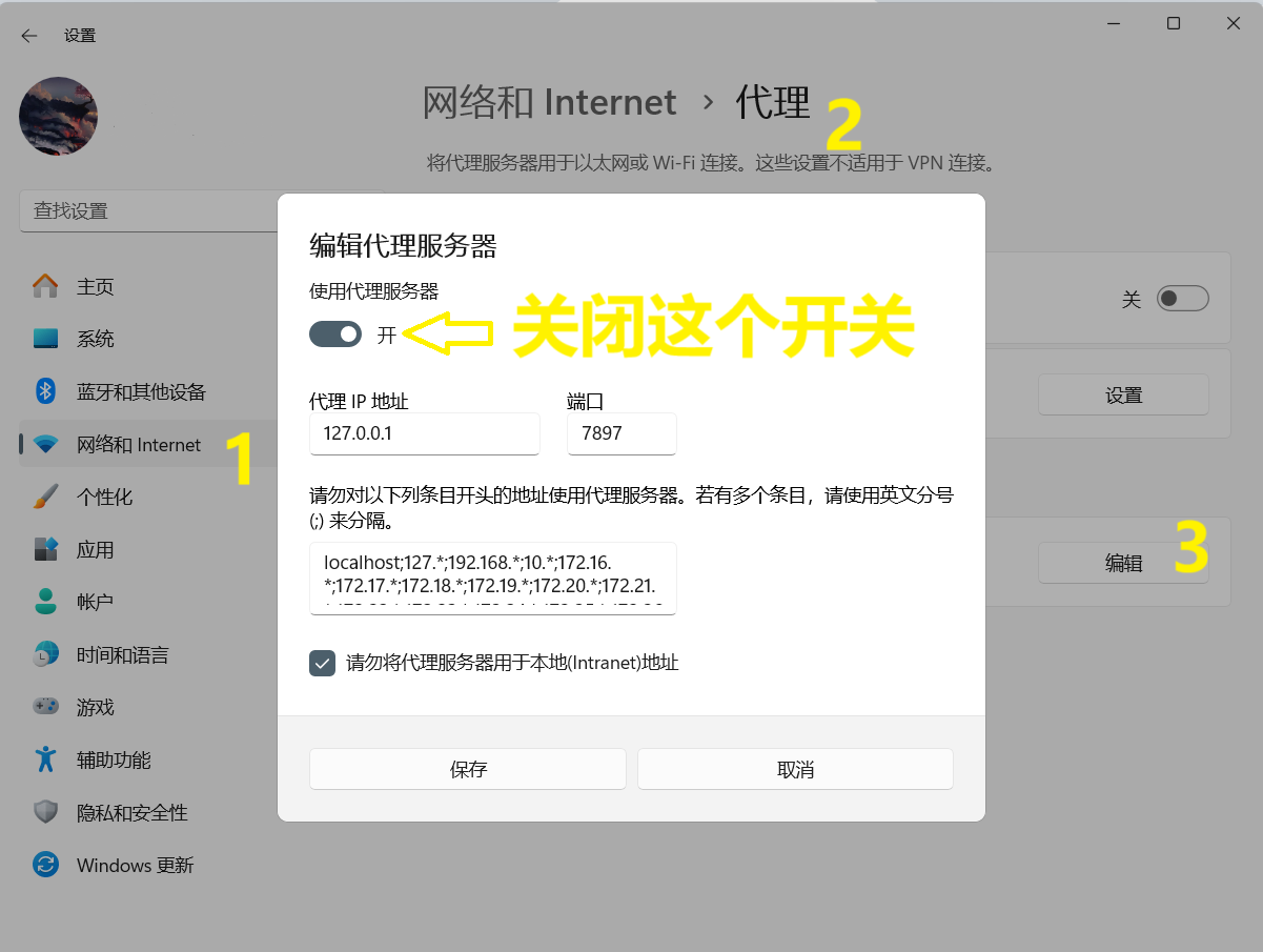 因为使用v2rayN或者clash之类的代理工具时,电脑系统会把上网数据通过系统代理交给代理工具,所以这个使用代理服务器的开关会打开,当没有代理工具时,这个开关自然要关闭,不然就访问不了网络。