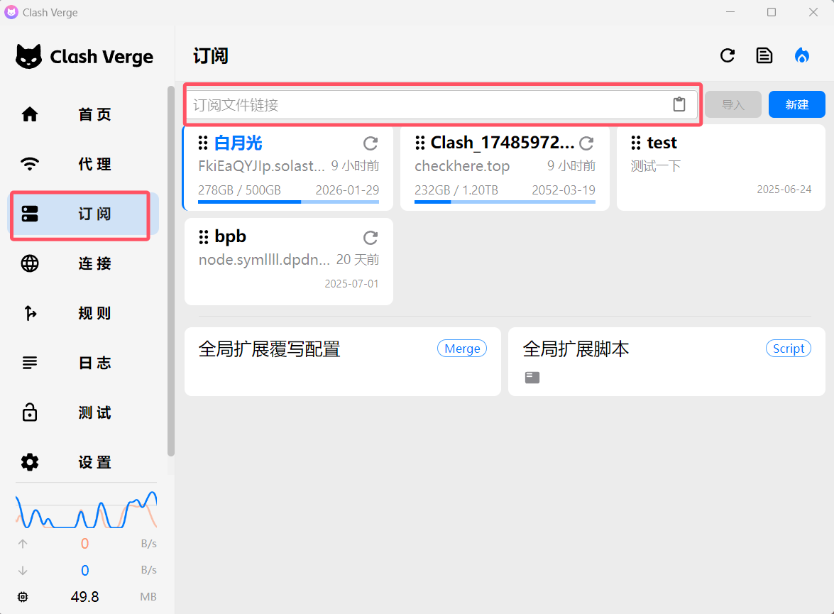 点击左边的订阅,在右上方输入订阅链接,然后点导入
