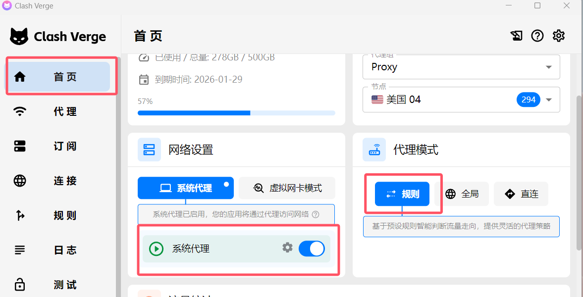 点击首页,在网络设置中打开系统代理,在代理模式中选择规则