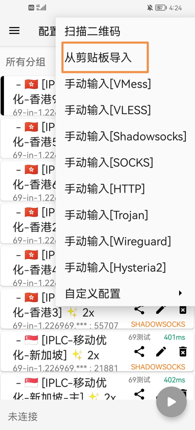 复制base64格式的节点,然后点击“+”号->从剪贴板导入,然后测延迟选择一个不是-1的节点连接上。